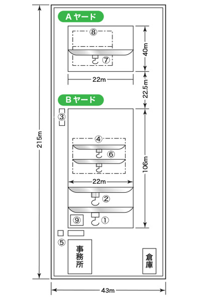 Bヤード:加工、製品置場エリア1 ⑥ 2.8t天井クレーン 2基 ⑦ 門型クレーン 10t × 22m 1 ⑧ 簡易式移動屋根 15B × 11L 2 ⑨ 形鋼歪矯正機 1